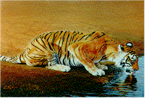 A Bengal tiger crouches to drink before the torrid heat of the day